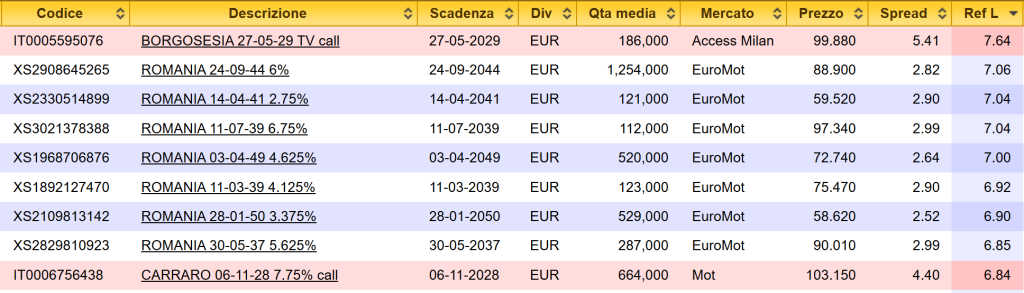 Riprendendo questi due aspetti e partendo dal presupposto che rischio e rendimento sono due facce della stessa medaglia, un aspetto interessante che emerge è che se si ordinano in ordine decrescente di rendimento offerto dai bond in Euro con taglio 1.000 (escludendo i subordinati), la classifica che emerge in fatto di emittenti è formata da Borgosesia, Romania e Carraro, come illustrato nell’immagine sottostante tratta da Skipper informatica.