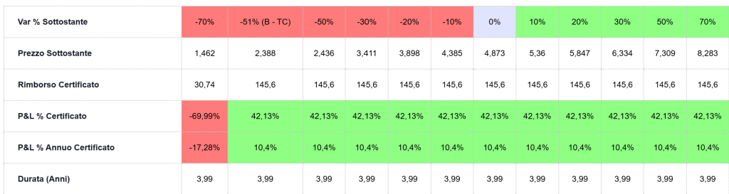 Per completare la descrizione, inserisco l’analisi di scenario a scadenza, tratta dal servizio Cedlapro, in cui si evince come questo certificato permetta di offrire un rendimento positivo anche a fronte di un ribasso del 50% del sottostante Worst Off.