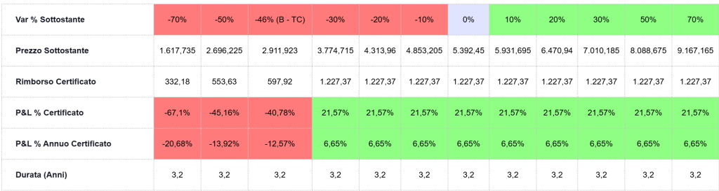 -un sottostante quota ad un livello inferiore rispetto alla barriera del 60%: il certificato perde la protezione del capitale e rimborsa un valore calcolato con la formula (Prezzo Finale del sottostante con performance peggiore / Fixing iniziale del sottostante con performance peggiore) * 1.000.
