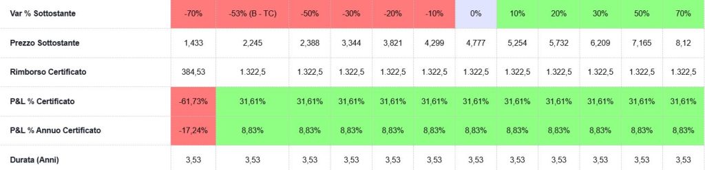 Per completare la descrizione, inserisco l’analisi di scenario a scadenza, tratta dal servizio Cedlapro, in cui si evince come questo certificato permetta di offrire un rendimento positivo anche a fronte di un ribasso del 53% del sottostante worst of.